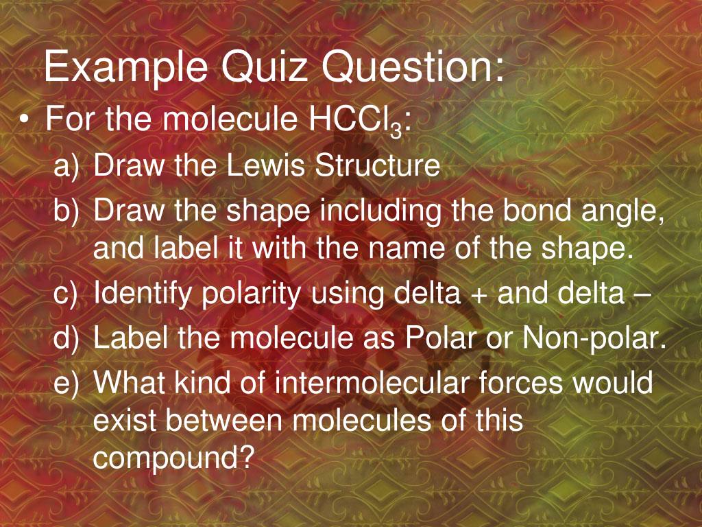 Example Quiz Question: • For the molecule HCCl3: • Draw the Lewis Structure • Draw the shape including the bond angle, and label it with the name of the shape. • Identify polarity using delta + and delta – • Label the molecule as Polar or Non-polar. • What kind of intermolecular forces would exist between molecules of this compound?