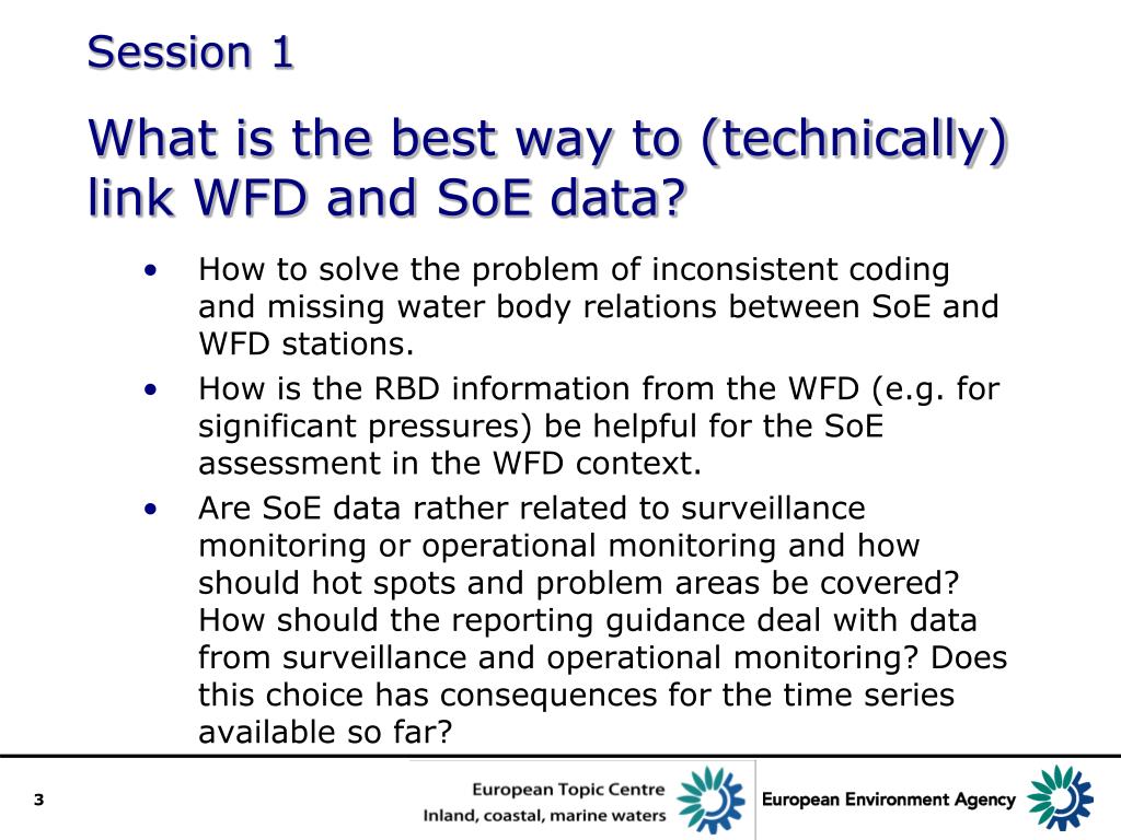 Session 1What is the best way to (technically) link WFD and SoE data? • How to solve the problem of inconsistent coding and missing water body relations between SoE and WFD stations. • How is the RBD information from the WFD (e.g. for significant pressures) be helpful for the SoE assessment in the WFD context. • Are SoE data rather related to surveillance monitoring or operational monitoring and how should hot spots and problem areas be covered? How should the reporting guidance deal with data from surveillance and operational monitoring? Does this choice has consequences for the time series available so far?