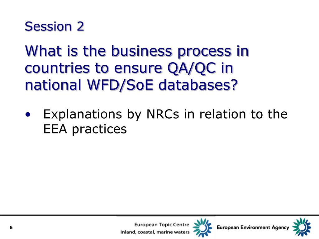 Session 2What is the business process in countries to ensure QA/QC in national WFD/SoE databases? • Explanations by NRCs in relation to the EEA practices