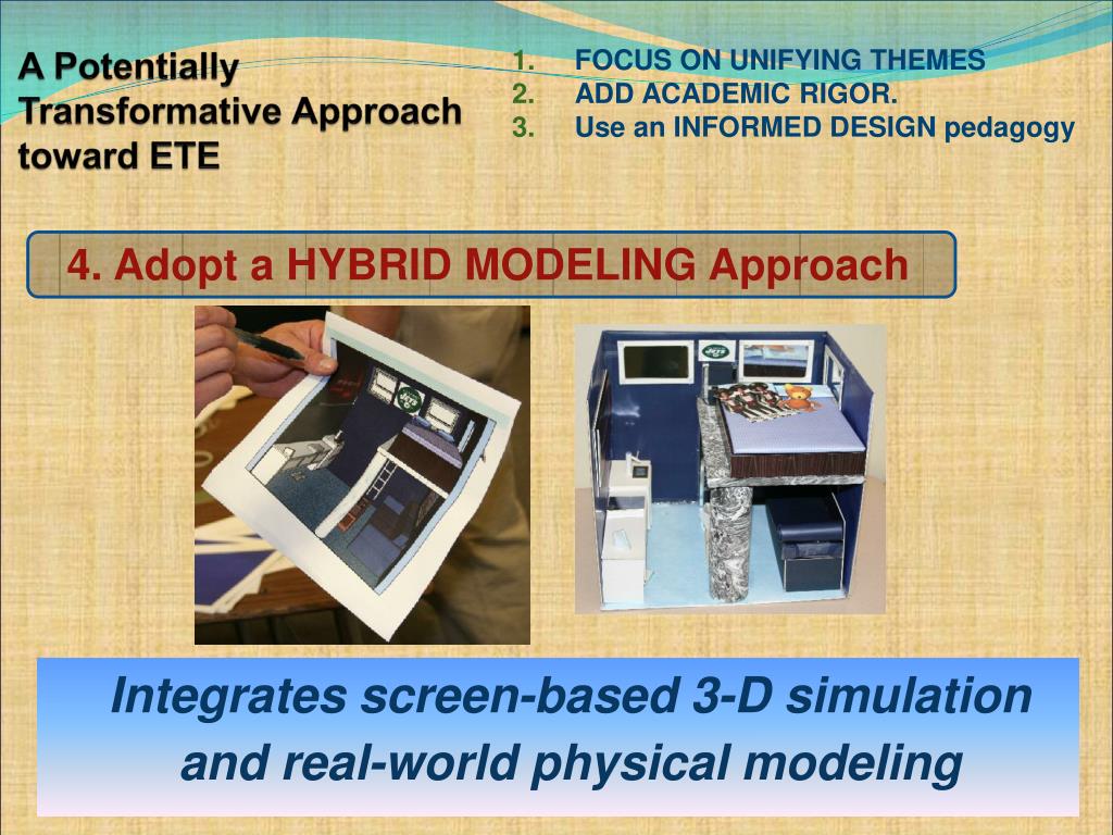 A Potentially Transformative Approach toward ETE • FOCUS ON UNIFYING THEMES • ADD ACADEMIC RIGOR. • Use an INFORMED DESIGN pedagogy 4. Adopt a HYBRID MODELING Approach Integrates screen-based 3-D simulation and real-world physical modeling