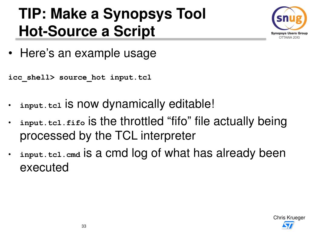 TIP: Make a Synopsys ToolHot-Source a Script Example input.tcl source constraints.tcl place_opt report_timing This is what gets written to input.tcl.fifo source constraints.tcl source_hot input.tcl 23 input.tcl.fifo input.tcl.cmd place_opt source_hot input.tcl 33 input.tcl.fifo input.tcl.cmd report_timing source_hot input.tcl 47 input.tcl.fifo input.tcl.cmd