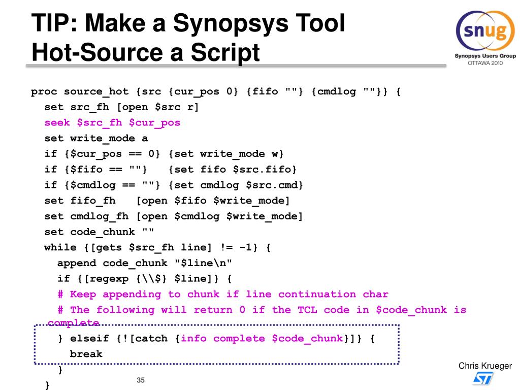 TIP: Make a Synopsys ToolHot-Source a Script proc source_hot {src {cur_pos 0} {fifo ""} {cmdlog ""}} { set src_fh [open $src r] seek $src_fh $cur_pos set write_mode a if {$cur_pos == 0} {set write_mode w} if {$fifo == ""} {set fifo $src.fifo} if {$cmdlog == ""} {set cmdlog $src.cmd} set fifo_fh [open $fifo $write_mode] set cmdlog_fh [open $cmdlog $write_mode] set code_chunk "" while {[gets $src_fh line] != -1} { append code_chunk "$line\n" if {[regexp {\\$} $line]} { # Keep appending to chunk if line continuation char # The following will return 0 if the TCL code in $code_chunk is complete } elseif {![catch {info complete $code_chunk}]} { break } }