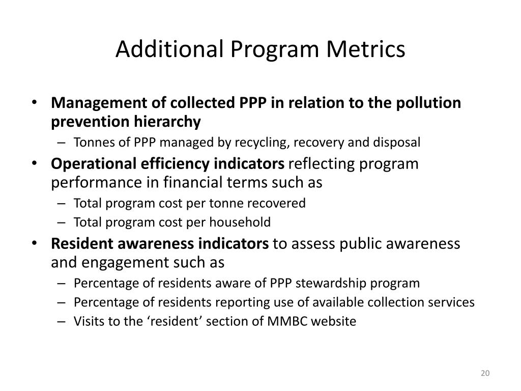 Additional Program Metrics • Management of collected PPP in relation to the pollution prevention hierarchy • Tonnes of PPP managed by recycling, recovery and disposal • Operational efficiency indicators reflecting program performance in financial terms such as • Total program cost per tonne recovered • Total program cost per household • Resident awareness indicators to assess public awareness and engagement such as • Percentage of residents aware of PPP stewardship program • Percentage of residents reporting use of available collection services • Visits to the ‘resident’ section of MMBC website