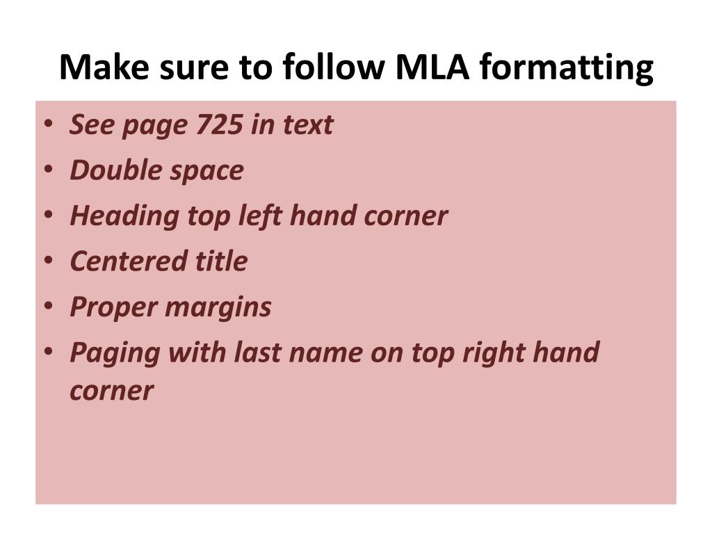 Make sure to follow MLA formatting • See page 725 in text • Double space • Heading top left hand corner • Centered title • Proper margins • Paging with last name on top right hand corner