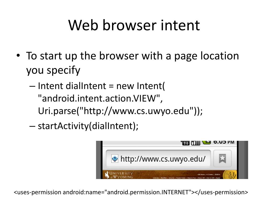 Web browser intent • To start up the browser with a page location you specify • Intent dialIntent = new Intent( "android.intent.action.VIEW", Uri.parse("http://www.cs.uwyo.edu")); • startActivity(dialIntent); <uses-permission android:name="android.permission.INTERNET"></uses-permission>