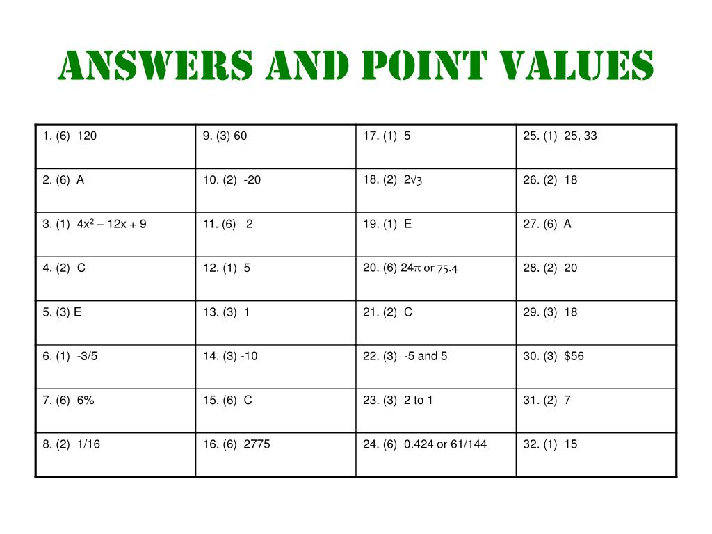 Rules • Divide students into groups of 2 or 3. • Pick an order for the groups. • Group #1 picks a question off of the “question bench.” While they are working on their question, each group should do the problem. • If Group #1 gets the problem right, they get the points. If they get it wrong, pick a card at random (cut out #’s from the last slide) and they get three seconds to answer (this is why each group should work on the question Group #1 selects). If the selected group gets it right they get the points. If they get it wrong, then pick another group until a group gets it right. • Repeat step 3 with Group #2 selecting a question off of the “question bench.” • Games ends when questions are gone or teacher decides to stop. Note: Pressing the green arrows on each slide takes the user back to the “question bench.”
