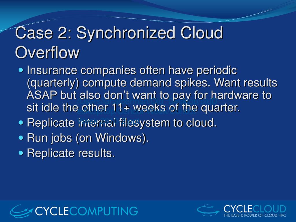 Case 2: Synchronized Cloud Overflow • Insurance companies often have periodic (quarterly) compute demand spikes. Want results ASAP but also don’t want to pay for hardware to sit idle the other 11+ weeks of the quarter. • Replicate internal filesystem to cloud. • Run jobs (on Windows). • Replicate results. /Users/ianalderman/Old_Desktop/oldDesktop/top/Condor Week/Condor Week 2010-2.ppt