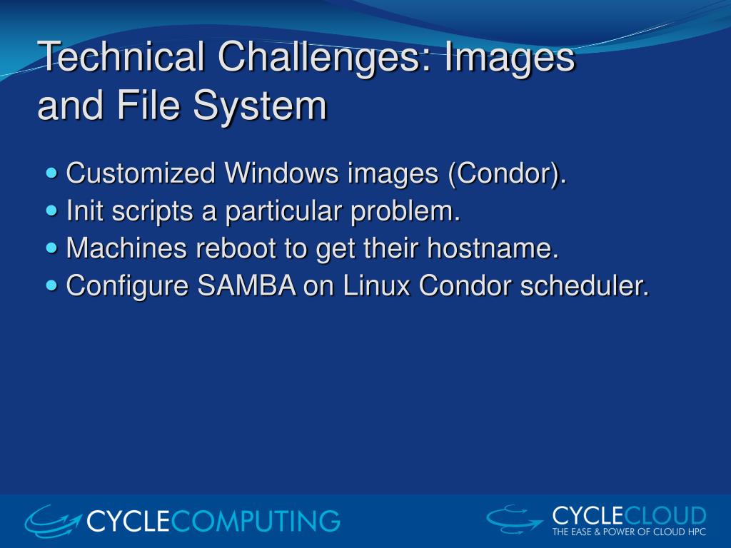 Technical Challenges: Images and File System • Customized Windows images (Condor). • Init scripts a particular problem. • Machines reboot to get their hostname. • Configure SAMBA on Linux Condor scheduler.