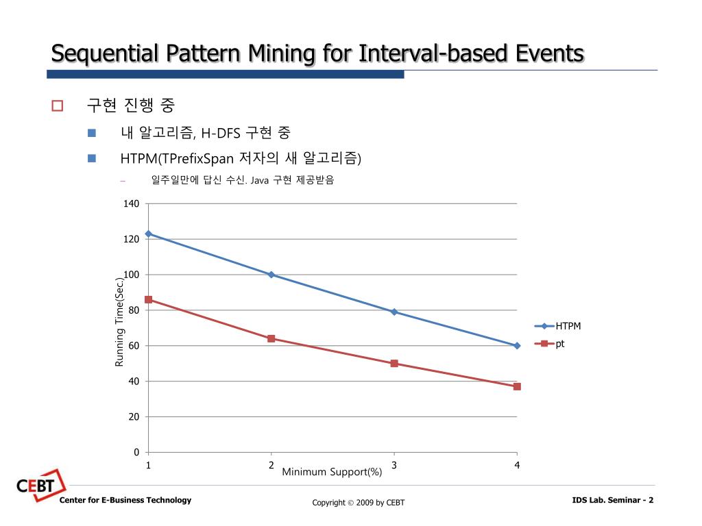 Research Meeting. Sungchan Park 2009-10-01. Sequential Pattern Mining for Interval-based Events. 구현 진행 중 내 알고리즘 , H-DFS 구현 중 HTPM(TPrefixSpan 저자의 새 알고리즘 ) 일주일만에 답신 수신 . Java 구현 제공받음. Running Time(Sec.). Minimum Support(%).
