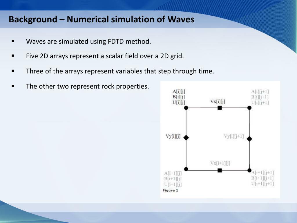 Background – Numerical simulation of Waves Waves are simulated using FDTD method. Five 2D arrays represent a scalar field over a 2D grid. Three of the arrays represent variables that step through time. The other two represent rock properties.