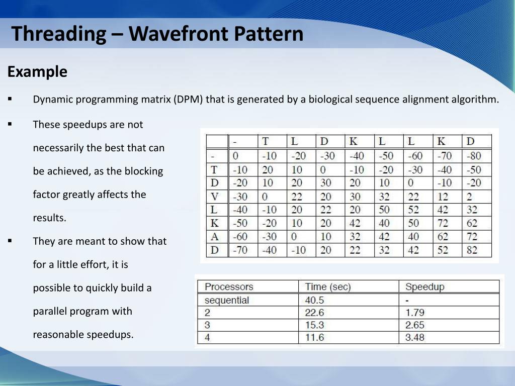 These speedups are not necessarily the best that can be achieved, as the blocking factor greatly affects the results. • They are meant to show that for a little effort, it is possible to quickly build a parallel program with reasonable speedups. Threading – Wavefront Pattern Example Dynamic programming matrix (DPM) that is generated by a biological sequence alignment algorithm.