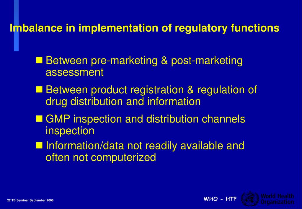 Imbalance in implementation of regulatory functions • Between pre-marketing & post-marketing assessment • Between product registration & regulation of drug distribution and information • GMP inspection and distribution channels inspection • Information/data not readily available and often not computerized