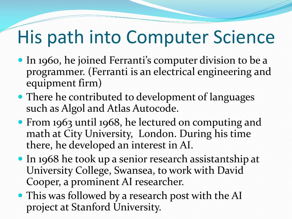 His path into Computer Science • In 1960, he joined Ferranti’s computer division to be a programmer. (Ferranti is an electrical engineering and equipment firm) • There he contributed to development of languages such as Algol and Atlas Autocode. • From 1963 until 1968, he lectured on computing and math at City University, London. During his time there, he developed an interest in AI. • In 1968 he took up a senior research assistantship at University College, Swansea, to work with David Cooper, a prominent AI researcher. • This was followed by a research post with the AI project at Stanford University.