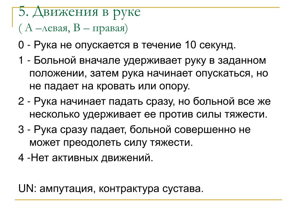 5. Движения в руке ( А –левая, B – правая) 0 - Рука не опускается в течение 10 секунд. 1 - Больной вначале удерживает руку в заданном положении, затем рука начинает опускаться, но не падает на кровать или опору. 2 - Рука начинает падать сразу, но больной все же несколько удерживает ее против силы тяжести. 3 - Рука сразу падает, больной совершенно не может преодолеть силу тяжести. 4 -Нет активных движений. UN: ампутация, контрактура сустава.