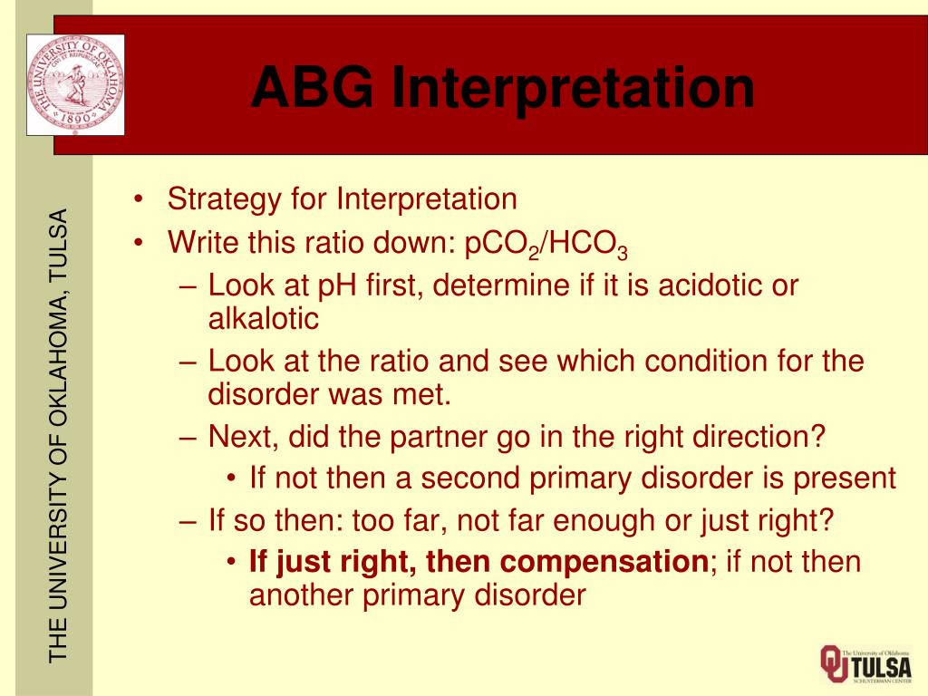 ABG Interpretation • Strategy for Interpretation • Write this ratio down: pCO2/HCO3 • Look at pH first, determine if it is acidotic or alkalotic • Look at the ratio and see which condition for the disorder was met. • Next, did the partner go in the right direction? • If not then a second primary disorder is present • If so then: too far, not far enough or just right? • If just right, then compensation; if not then another primary disorder