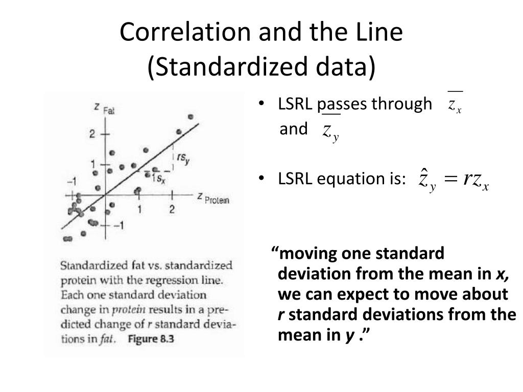 Correlation and the Line(Standardized data) • LSRL passes through and • LSRL equation is: “moving one standard deviation from the mean in x, we can expect to move about r standard deviations from the mean in y .”
