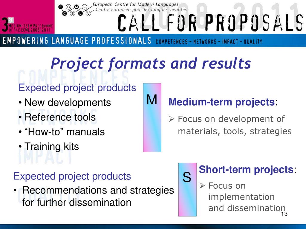 Project formats and results • Expected project products • New developments • Reference tools • “How-to”manuals • Training kits M • Medium-term projects: • Focus on development of materials, tools, strategies Short-term projects: • Focus on implementation and dissemination Expected project products • Recommendations and strategiesfor further dissemination S