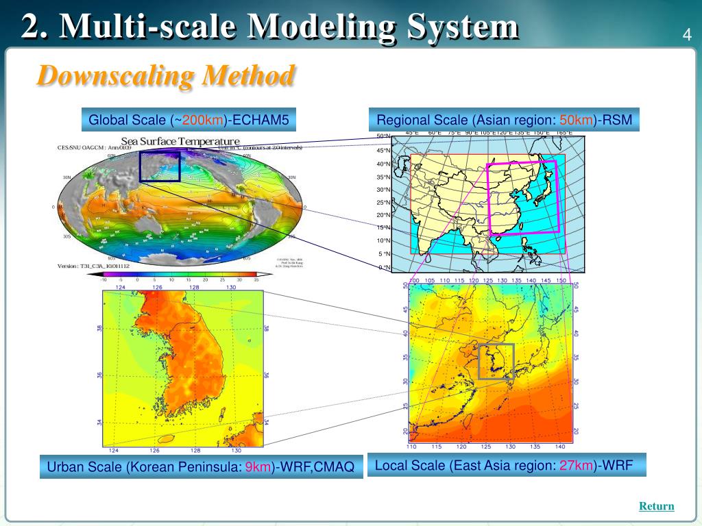 Global Scale (~200km)-ECHAM5 Regional Scale (Asian region: 50km)-RSM Local Scale (East Asia region: 27km)-WRF Urban Scale (Korean Peninsula: 9km)-WRF,CMAQ 2. Multi-scale Modeling System Downscaling Method Return