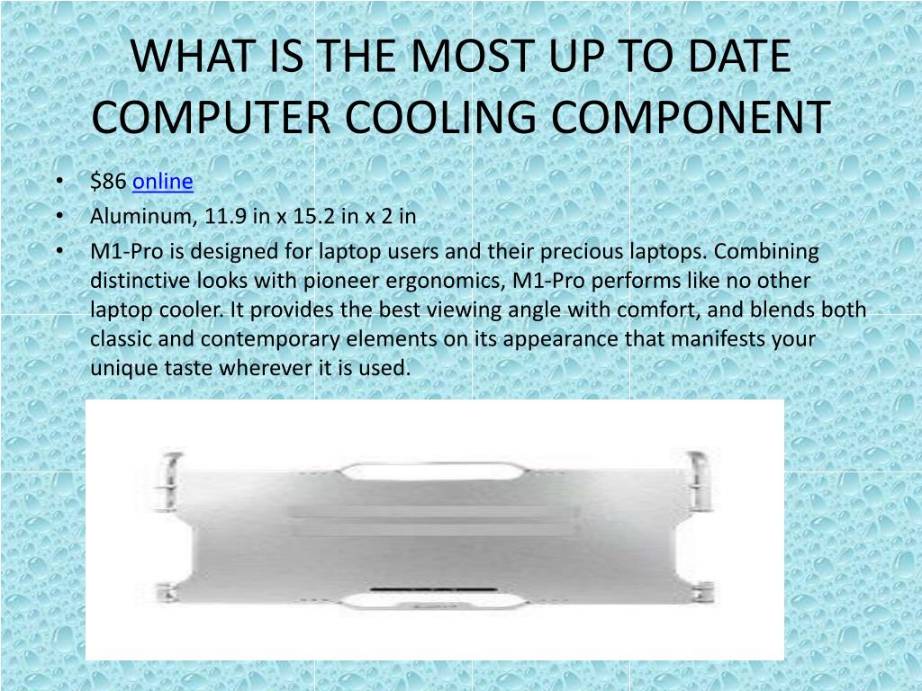 WHAT IS THE MOST UP TO DATE COMPUTER COOLING COMPONENT • $86 online • Aluminum, 11.9 in x 15.2 in x 2 in • M1-Pro is designed for laptop users and their precious laptops. Combining distinctive looks with pioneer ergonomics, M1-Pro performs like no other laptop cooler. It provides the best viewing angle with comfort, and blends both classic and contemporary elements on its appearance that manifests your unique taste wherever it is used.