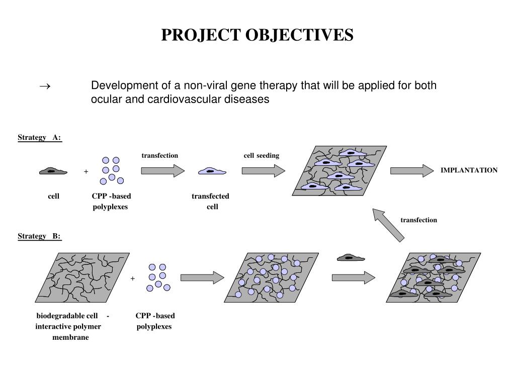 Strategy A: transfection cell seeding IMPLANTATION + cell CPP - based transfected polyplexes cell transfection Strategy B: + biodegradable cell - CPP - based interactive polymer polyplexes membrane PROJECT OBJECTIVES Development of a non-viral gene therapy that will be applied for both ocular and cardiovascular diseases
