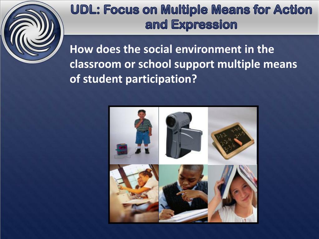 UDL: Focus on Multiple Means for Action and Expression How does the social environment in the classroom or school support multiple means of student participation?
