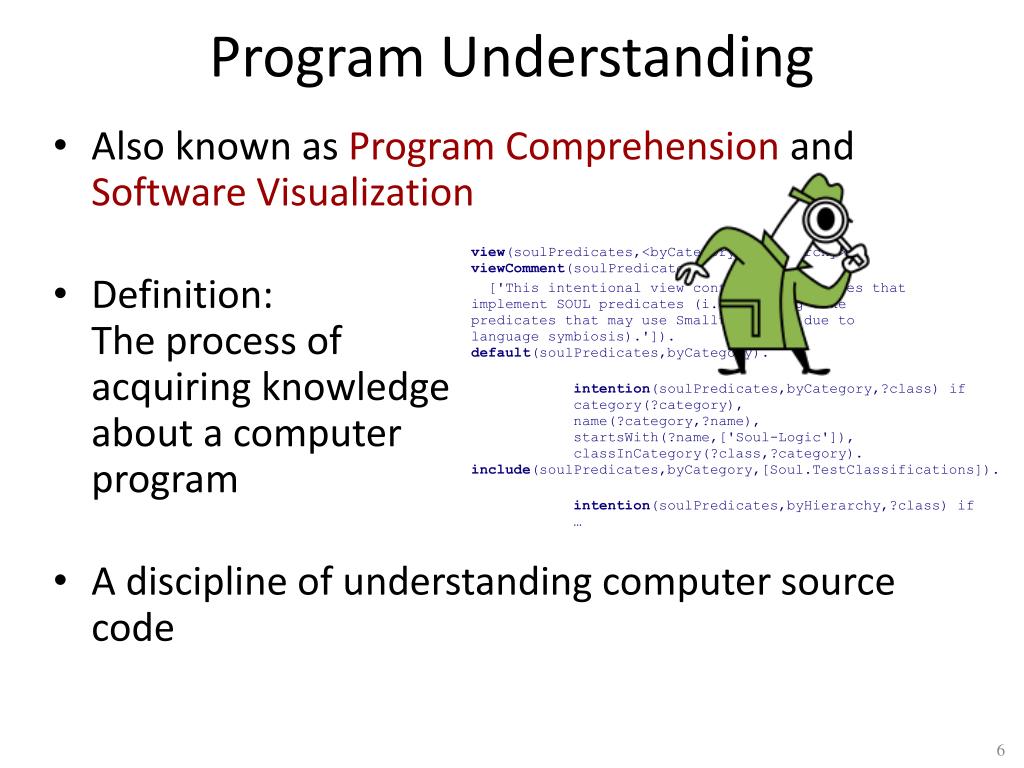 Program Understanding • Also known as Program Comprehension and Software Visualization • Definition:The process of acquiring knowledgeabout a computerprogram • A discipline of understanding computer source code view(soulPredicates,<byCategory,byHierarchy>).viewComment(soulPredicates, ['This intentional view contains ALL classes that implement SOUL predicates (i.e., Prolog-like predicates that may use Smalltalk code due to language symbiosis).']).default(soulPredicates,byCategory). intention(soulPredicates,byCategory,?class) ifcategory(?category),name(?category,?name),startsWith(?name,['Soul-Logic']),classInCategory(?class,?category).include(soulPredicates,byCategory,[Soul.TestClassifications]). intention(soulPredicates,byHierarchy,?class) if …