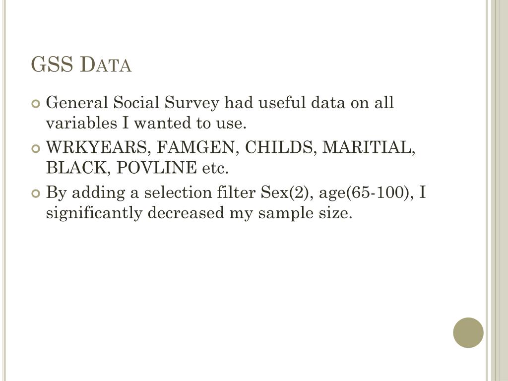 GSS Data • General Social Survey had useful data on all variables I wanted to use. • WRKYEARS, FAMGEN, CHILDS, MARITIAL, BLACK, POVLINE etc. • By adding a selection filter Sex(2), age(65-100), I significantly decreased my sample size.