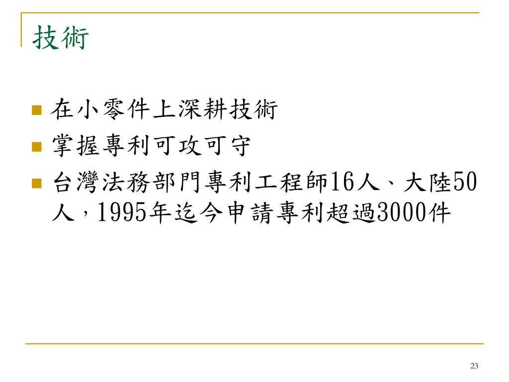技術 • 在小零件上深耕技術 • 掌握專利可攻可守 • 台灣法務部門專利工程師16人、大陸50人,1995年迄今申請專利超過3000件
