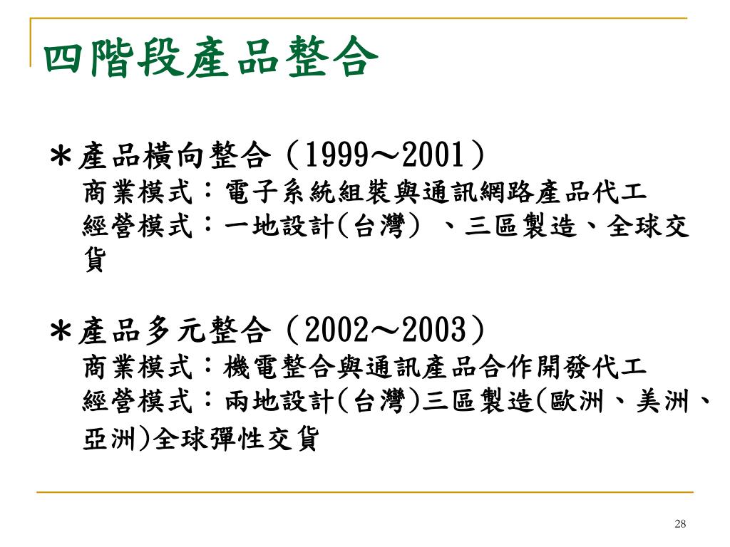 四階段產品整合 *產品橫向整合(1999~2001)商業模式:電子系統組裝與通訊網路產品代工經營模式:一地設計(台灣) 、三區製造、全球交 貨 *產品多元整合(2002~2003)商業模式:機電整合與通訊產品合作開發代工經營模式:兩地設計(台灣)三區製造(歐洲、美洲、亞洲)全球彈性交貨