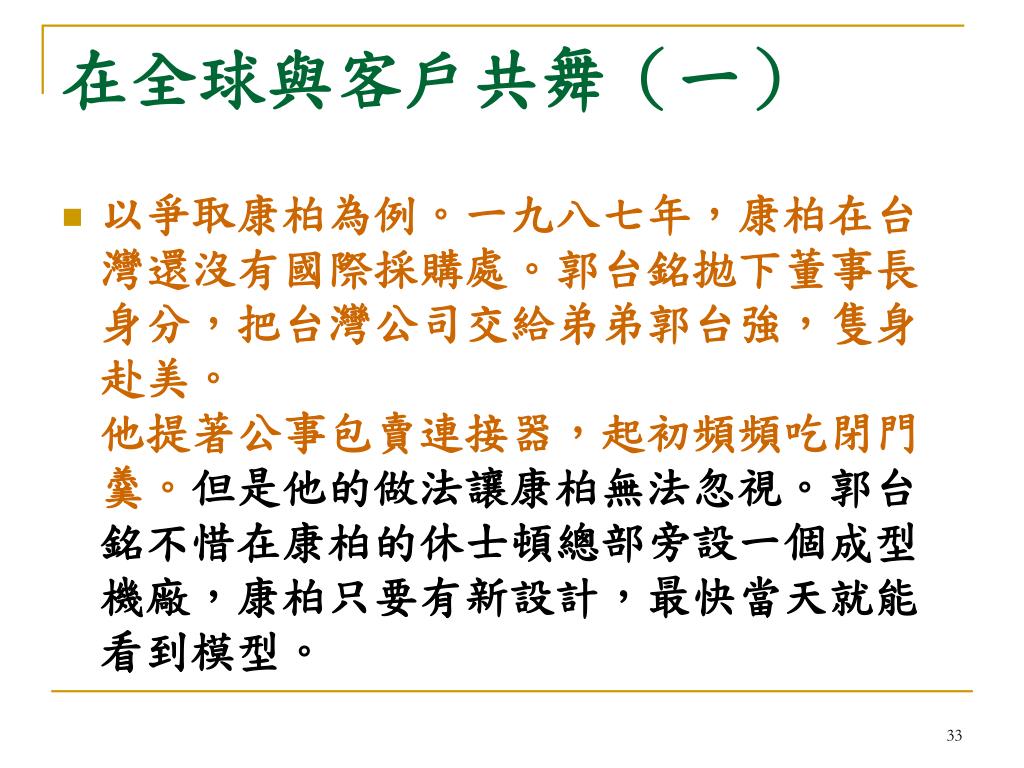 在全球與客戶共舞(一) • 以爭取康柏為例。一九八七年,康柏在台灣還沒有國際採購處。郭台銘拋下董事長身分,把台灣公司交給弟弟郭台強,隻身赴美。 他提著公事包賣連接器,起初頻頻吃閉門羹。但是他的做法讓康柏無法忽視。郭台銘不惜在康柏的休士頓總部旁設一個成型機廠,康柏只要有新設計,最快當天就能看到模型。