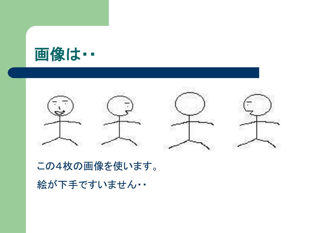 アニメーションの原理 今日作るアニメーションはパラパラ漫画のようにします。 つまり、画面を少しずつ変えて表示していきます。