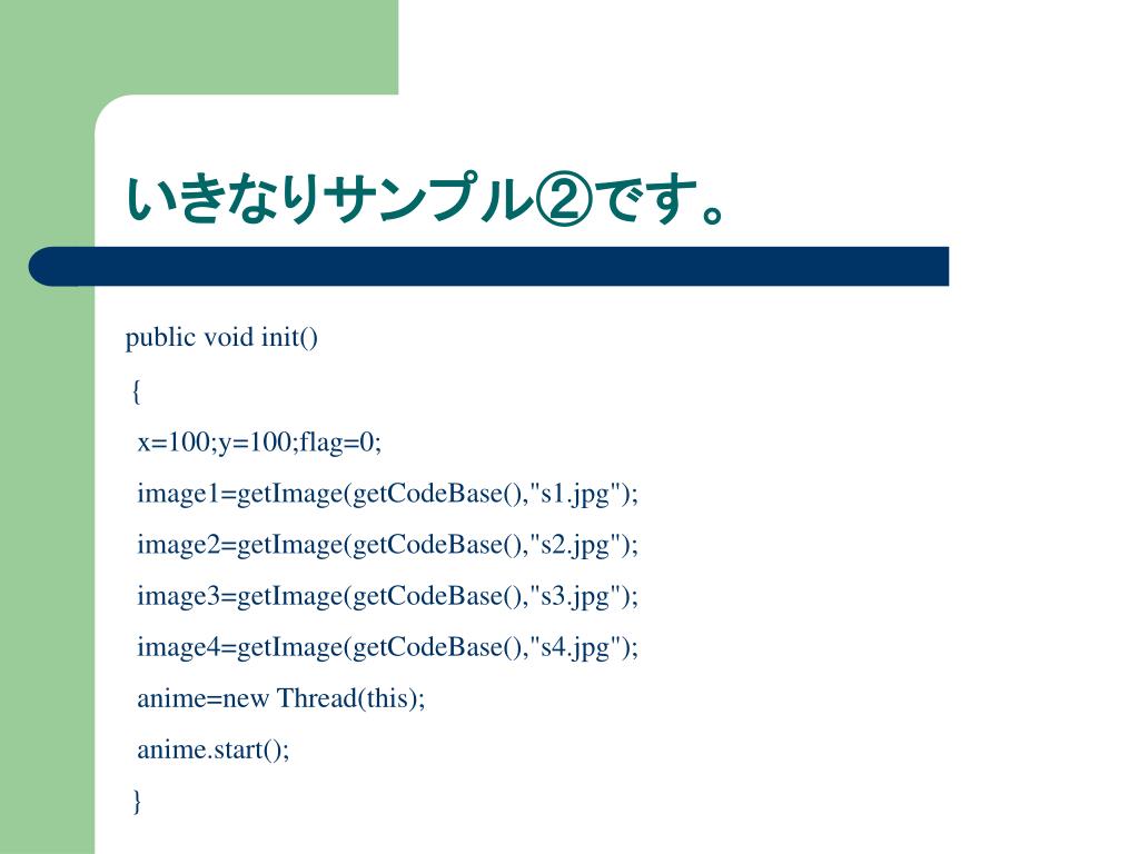 いきなりサンプル②です。 public void init() { x=100;y=100;flag=0; image1=getImage(getCodeBase(),"s1.jpg"); image2=getImage(getCodeBase(),"s2.jpg"); image3=getImage(getCodeBase(),"s3.jpg"); image4=getImage(getCodeBase(),"s4.jpg"); anime=new Thread(this); anime.start(); }