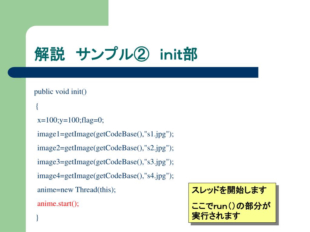 解説 サンプル② init部 public void init() { x=100;y=100;flag=0; image1=getImage(getCodeBase(),"s1.jpg"); image2=getImage(getCodeBase(),"s2.jpg"); image3=getImage(getCodeBase(),"s3.jpg"); image4=getImage(getCodeBase(),"s4.jpg"); anime=new Thread(this); anime.start(); } スレッドを使える状況 にします