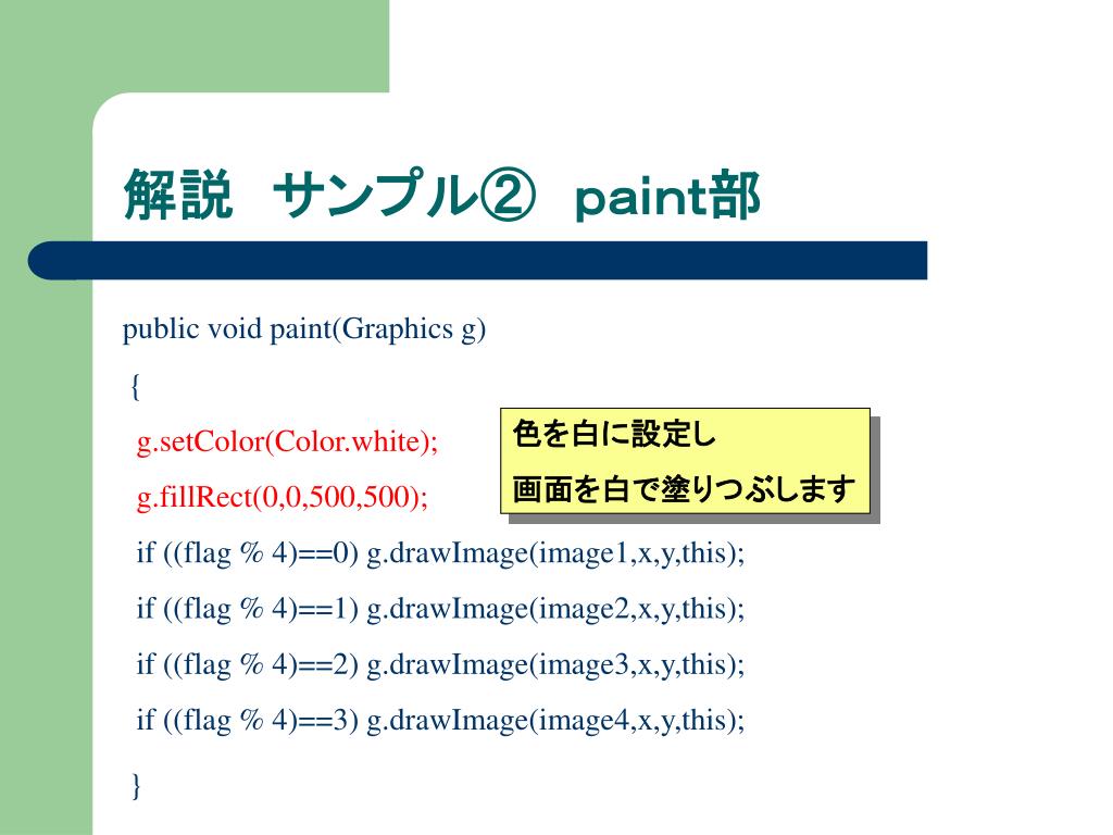 解説 サンプル② paint部 public void paint(Graphics g) { g.setColor(Color.white); g.fillRect(0,0,500,500); if ((flag % 4)==0) g.drawImage(image1,x,y,this); if ((flag % 4)==1) g.drawImage(image2,x,y,this); if ((flag % 4)==2) g.drawImage(image3,x,y,this); if ((flag % 4)==3) g.drawImage(image4,x,y,this); } 色を白に設定し 画面を白で塗りつぶします
