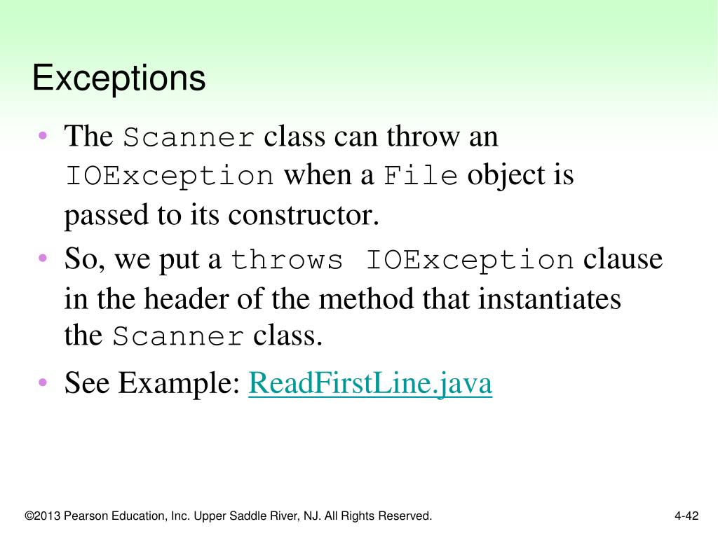 Exceptions The Scanner class can throw an IOException when a File object is passed to its constructor. So, we put a throws IOException clause in the header of the method that instantiates the Scanner class. See Example: ReadFirstLine.java