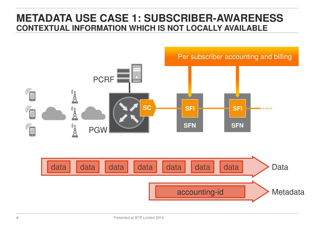 metadata Use case 1: subscriber-awarenesscontextual information which is not locally available Per subscriber accounting and billing PCRF SFN SFN SC SFI SFI PGW Data data data data data data data data Metadata accounting-id