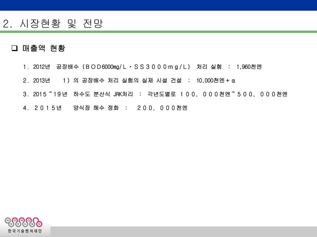 2. 시장현황 및 전망 • 매출액 현황 1.2012년공장배수(BOD6000mg/L・SS3000mg/L) 처리 실험:1,960천엔 2.2013년 1)의 공장배수 처리 실험의 실제 시설 건설 :10,000천엔+α 3.2015~19년하수도 분산식 JRK처리:각년도별로 100,000천엔~500,000천엔 4.2015년양식장 해수 정화 :200,000천엔