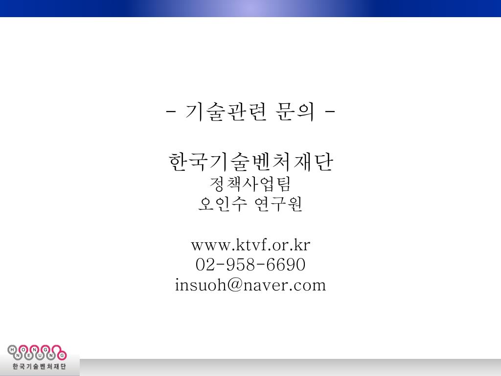 - 기술관련 문의 - 한국기술벤처재단 정책사업팀 오인수 연구원 www.ktvf.or.kr 02-958-6690 insuoh@naver.com