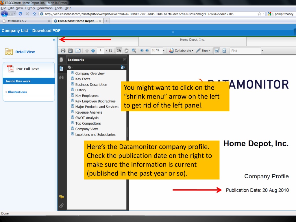 You might want to click on the “shrink menu” arrow on the left to get rid of the left panel. Here’s the Datamonitor company profile. Check the publication date on the right to make sure the information is current (published in the past year or so).