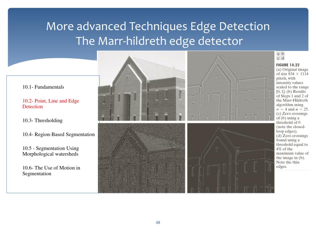 More advanced Techniques Edge Detection The Marr-hildreth edge detector • 10.1- Fundamentals • 10.2- Point, Line and Edge Detection • 10.3-Thresholding • 10.4- Region-Based Segmentation • 10.5 - Segmentation Using Morphological watersheds • 10.6- The Use of Motion in Segmentation