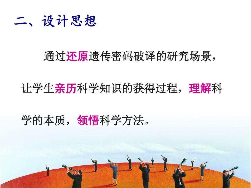 二、设计思想 • 通过还原遗传密码破译的研究场景,让学生亲历科学知识的获得过程,理解科学的本质,领悟科学方法。