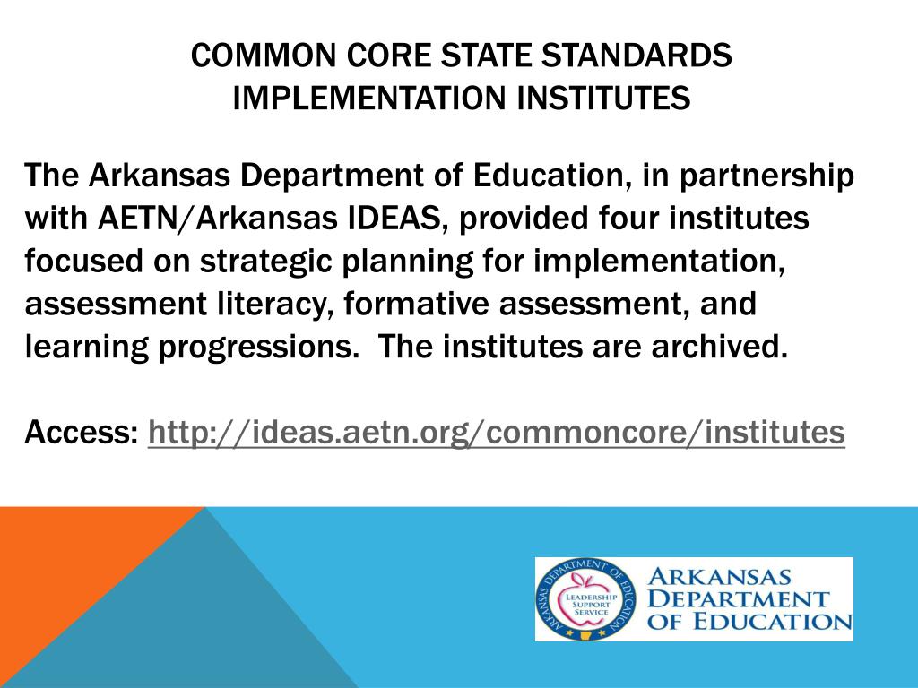 COMMON CORE STATE STANDARDS IMPLEMENTATION INSTITUTES The Arkansas Department of Education, in partnership with AETN/Arkansas IDEAS, provided four institutes focused on strategic planning for implementation, assessment literacy, formative assessment, and learning progressions. The institutes are archived. Access: http://ideas.aetn.org/commoncore/institutes