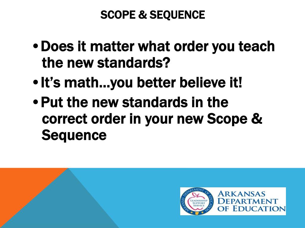 Scope & Sequence • •Does it matter what order you teach the new standards? • •It’s math…you better believe it! • •Put the new standards in the correct order in your new Scope & Sequence