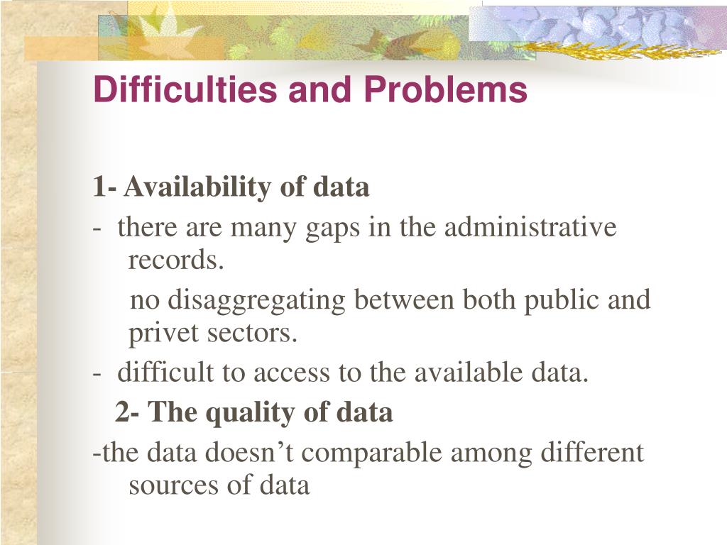 Difficulties and Problems 1- Availability of data - there are many gaps in the administrative records. no disaggregating between both public and privet sectors. - difficult to access to the available data. 2- The quality of data -the data doesn’t comparable among different sources of data