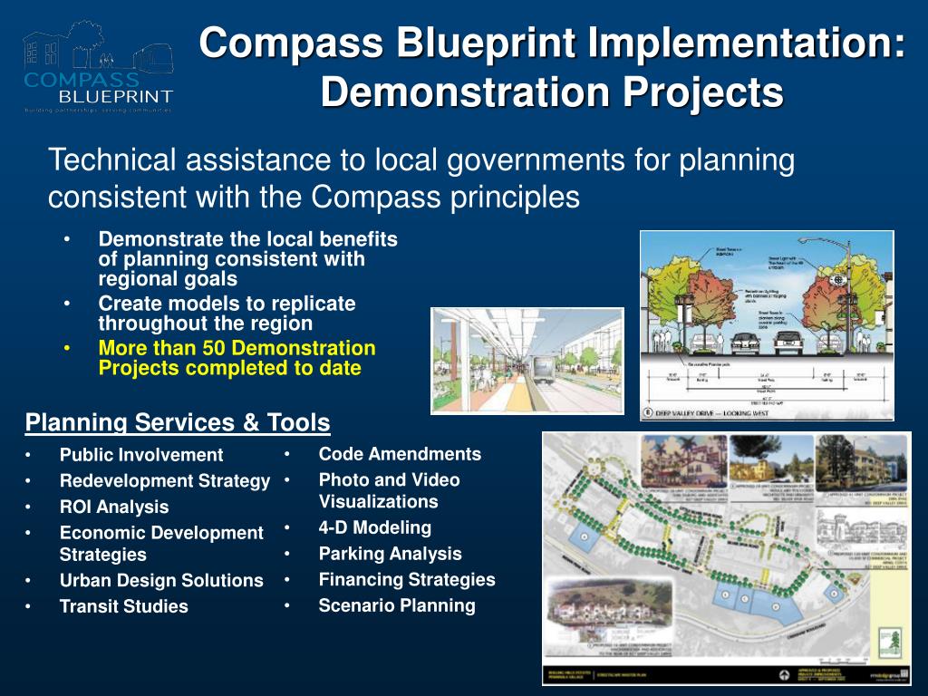 Compass Blueprint Implementation:Demonstration Projects Technical assistance to local governments for planning consistent with the Compass principles • Demonstrate the local benefits of planning consistent with regional goals • Create models to replicate throughout the region • More than 50 Demonstration Projects completed to date • Planning Services & Tools • Public Involvement • Redevelopment Strategy • ROI Analysis • Economic DevelopmentStrategies • Urban Design Solutions • Transit Studies • Code Amendments • Photo and Video Visualizations • 4-D Modeling • Parking Analysis • Financing Strategies • Scenario Planning