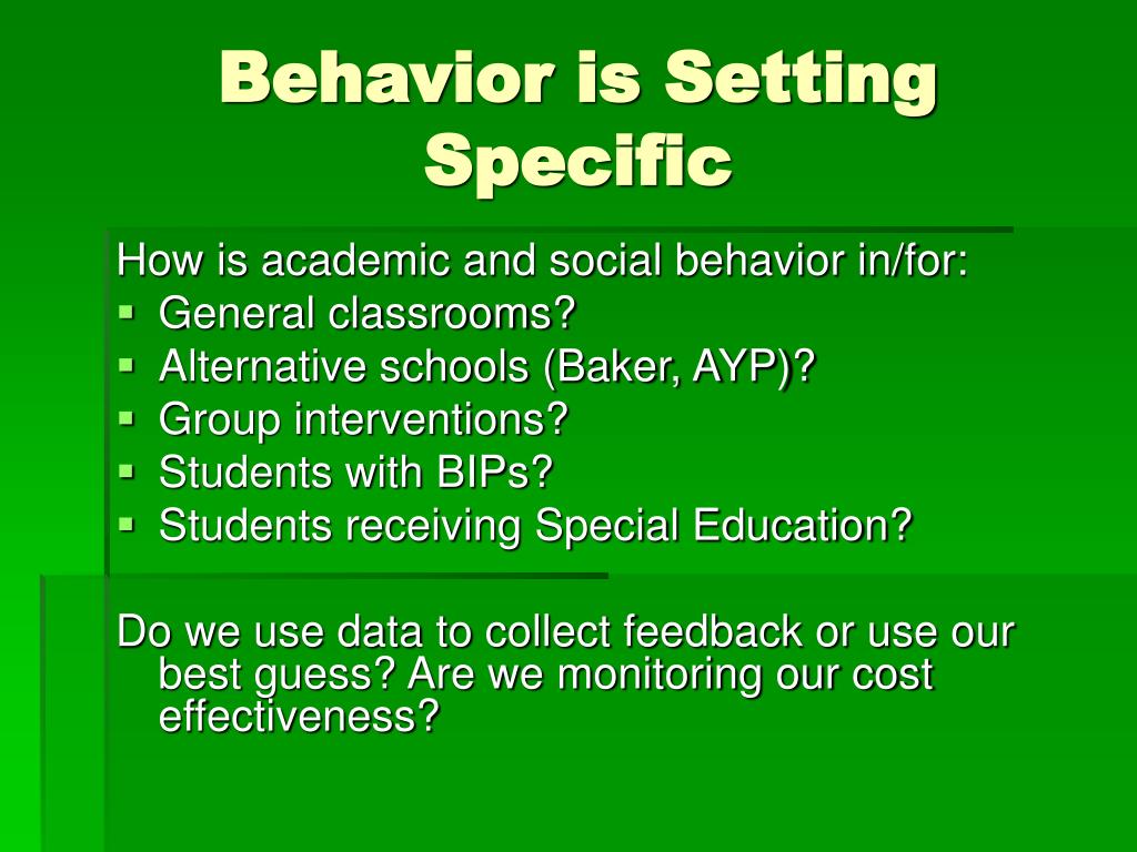 Behavior is Setting Specific How is academic and social behavior in/for: • General classrooms? • Alternative schools (Baker, AYP)? • Group interventions? • Students with BIPs? • Students receiving Special Education? Do we use data to collect feedback or use our best guess? Are we monitoring our cost effectiveness?