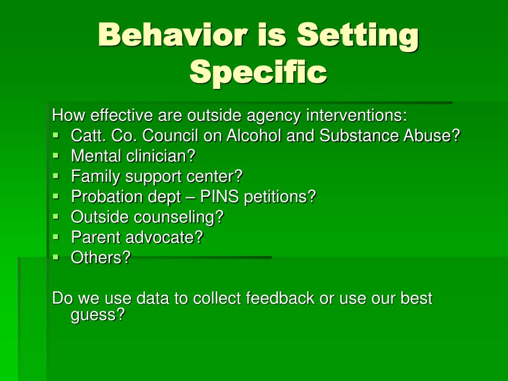Behavior is Setting Specific How effective are outside agency interventions: • Catt. Co. Council on Alcohol and Substance Abuse? • Mental clinician? • Family support center? • Probation dept – PINS petitions? • Outside counseling? • Parent advocate? • Others? Do we use data to collect feedback or use our best guess?