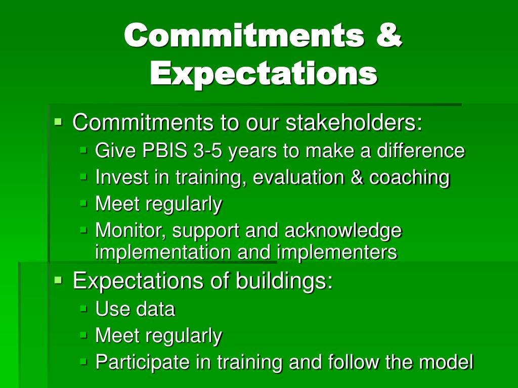 Commitments & Expectations • Commitments to our stakeholders: • Give PBIS 3-5 years to make a difference • Invest in training, evaluation & coaching • Meet regularly • Monitor, support and acknowledge implementation and implementers • Expectations of buildings: • Use data • Meet regularly • Participate in training and follow the model