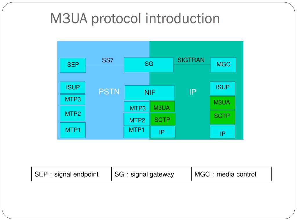 M3UA function • M3UA (MTP3 User Adaptation) protocol supports the transport of any SS7 MTP3-User signaling (e.g., ISUP and SCCP messages) over IP using the services of the Stream Control Transmission Protocol. • Also, provision is made for protocol elements that enable a seamless operation of the MTP3-User peers in the SS7 and IP domains. This protocol would be used between a Signaling Gateway (SG) and a Media Gateway Controller (MGC) or IP-resident Database, or between two IP-based applications.