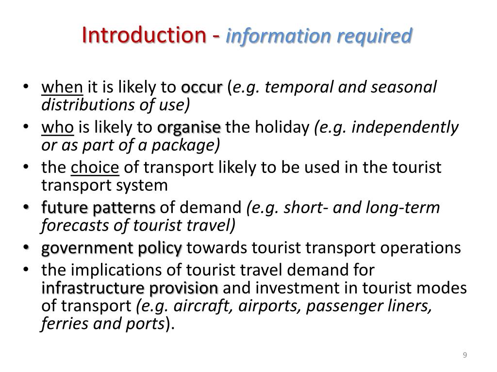 Introduction - informationrequired • when it is likely to occur (e.g. temporal and seasonal distributions of use) • whois likely to organise the holiday (e.g. independently or as part of a package) • the choice of transport likely to be used in the tourist transport system • future patterns of demand (e.g. short- and long-term forecasts of tourist travel) • government policy towards tourist transport operations • the implications of tourist travel demand for infrastructure provision andinvestmentin tourist modes of transport (e.g. aircraft, airports, passenger liners, ferries and ports).